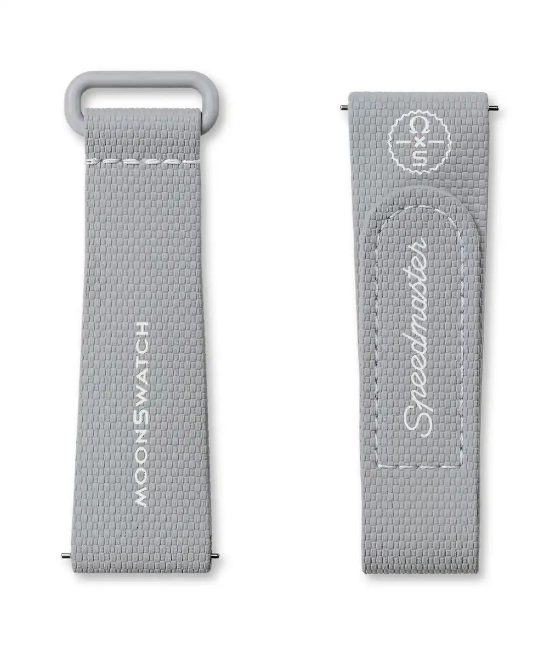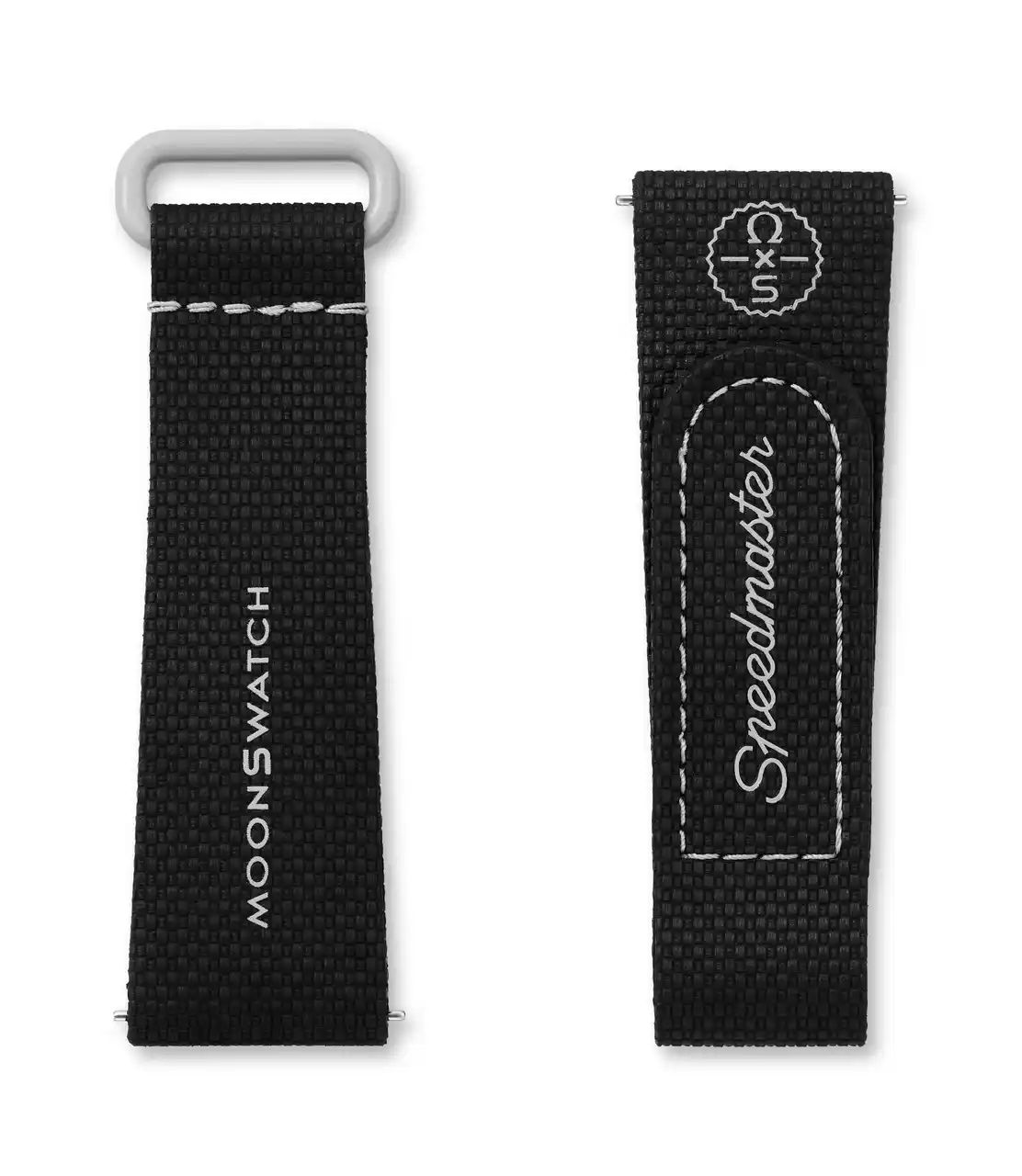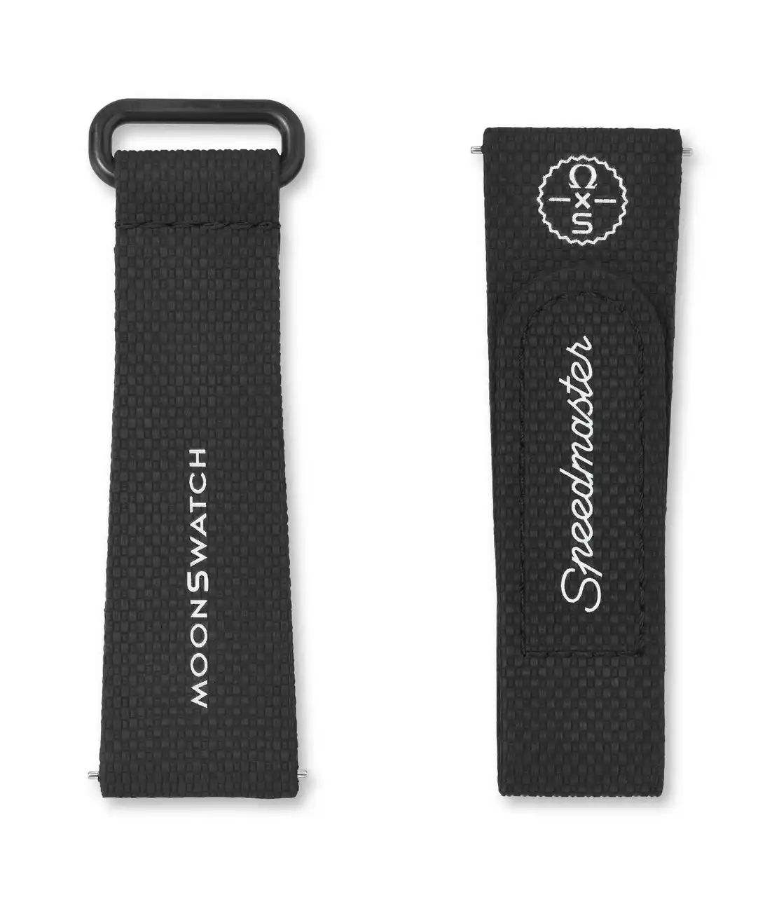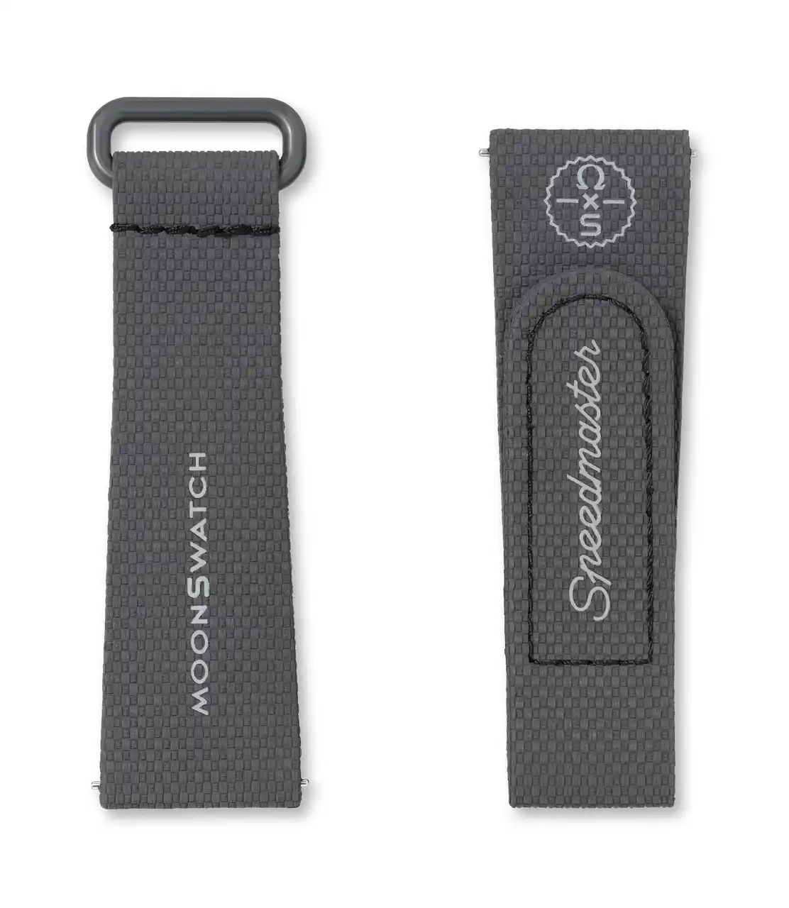 高品質のラバー製で、両面にテクスチャーパターンが施され、BioceramicループとVELCRO(R)クロージャーを採用しているのが特徴。ストラップは表側が宇宙服、裏側が月面のクレーターをイメージしています。Bioceramic MoonSwatch コレクションの時計と同様に、ストラップにもOMEGA X Swatch、MoonSwatch、そしてアイコニックなSpeedmasterのロゴがあしらわれています。 また、どのストラップにもクイックリリースシステムが装備され、ストラップの簡単な交換が可能な専用ツールが付属しています。 |