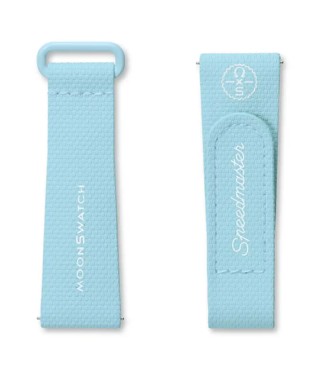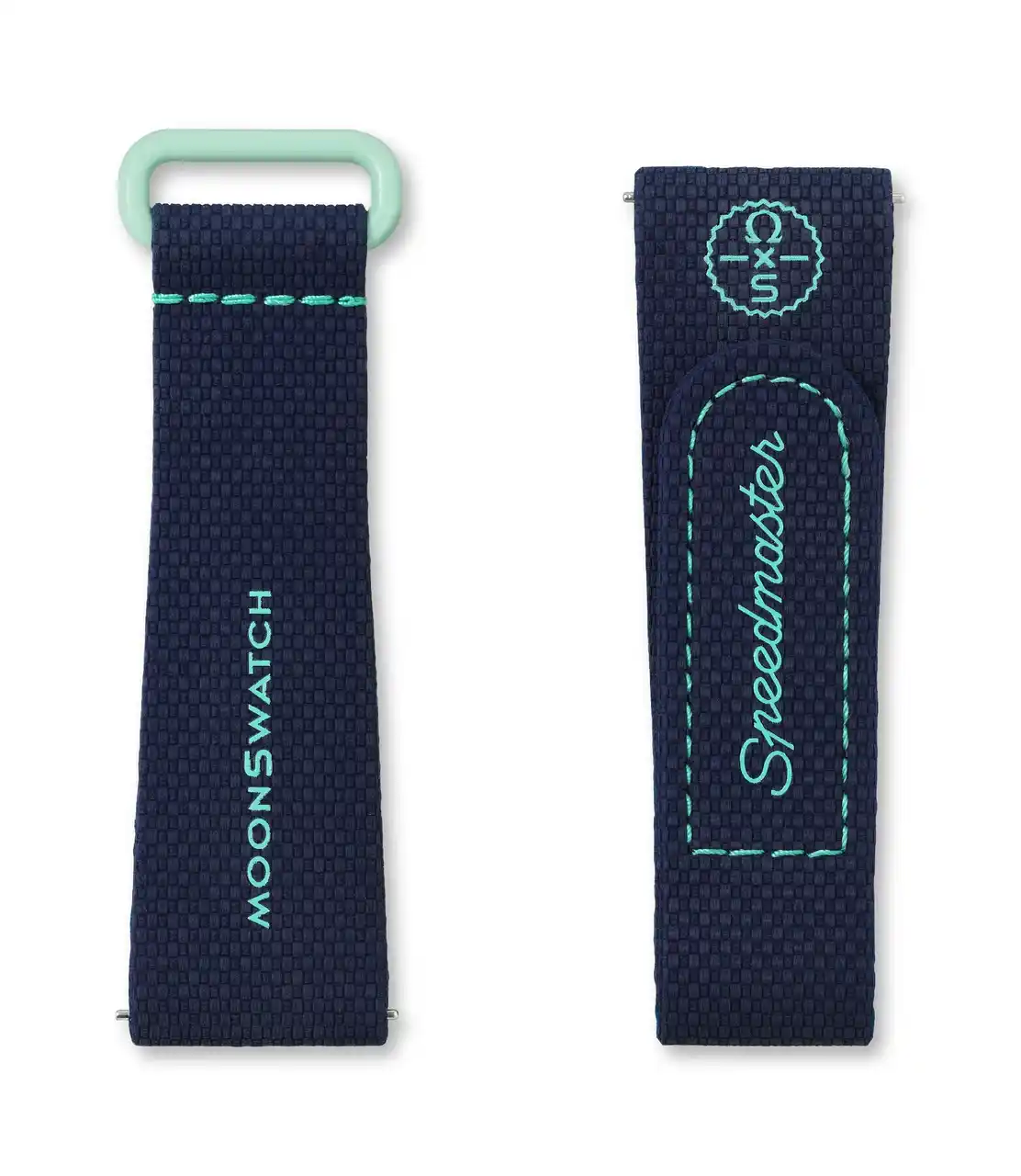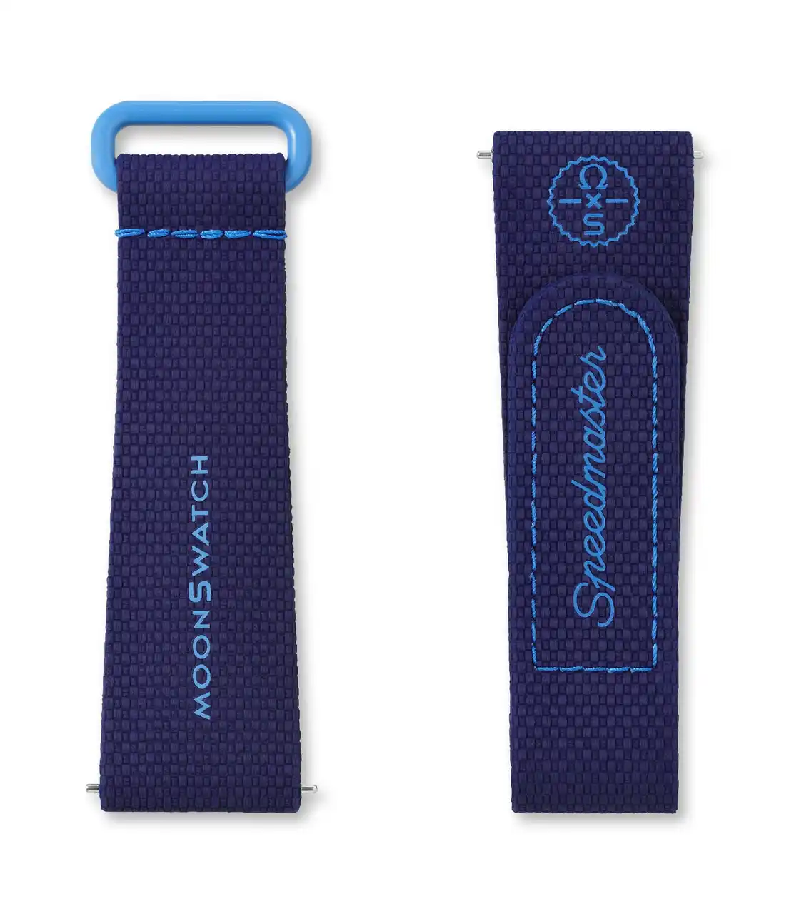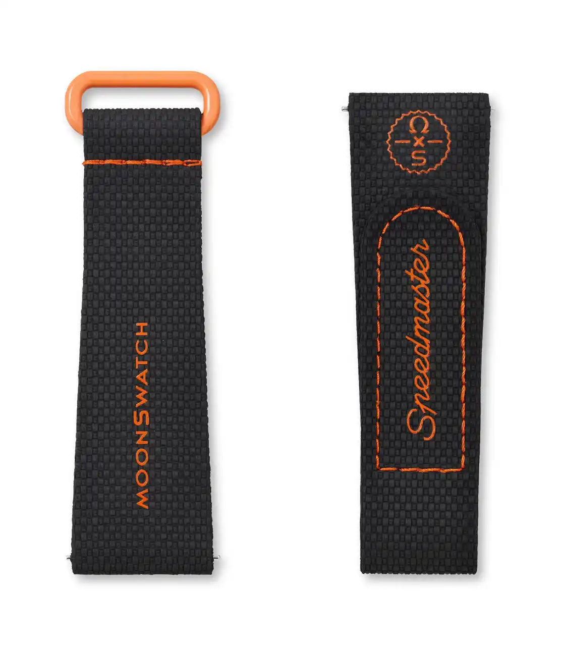 高品質のラバー製で、両面にテクスチャーパターンが施され、BioceramicループとVELCRO(R)クロージャーを採用しているのが特徴。ストラップは表側が宇宙服、裏側が月面のクレーターをイメージしています。Bioceramic MoonSwatch コレクションの時計と同様に、ストラップにもOMEGA X Swatch、MoonSwatch、そしてアイコニックなSpeedmasterのロゴがあしらわれています。 また、どのストラップにもクイックリリースシステムが装備され、ストラップの簡単な交換が可能な専用ツールが付属しています。 |