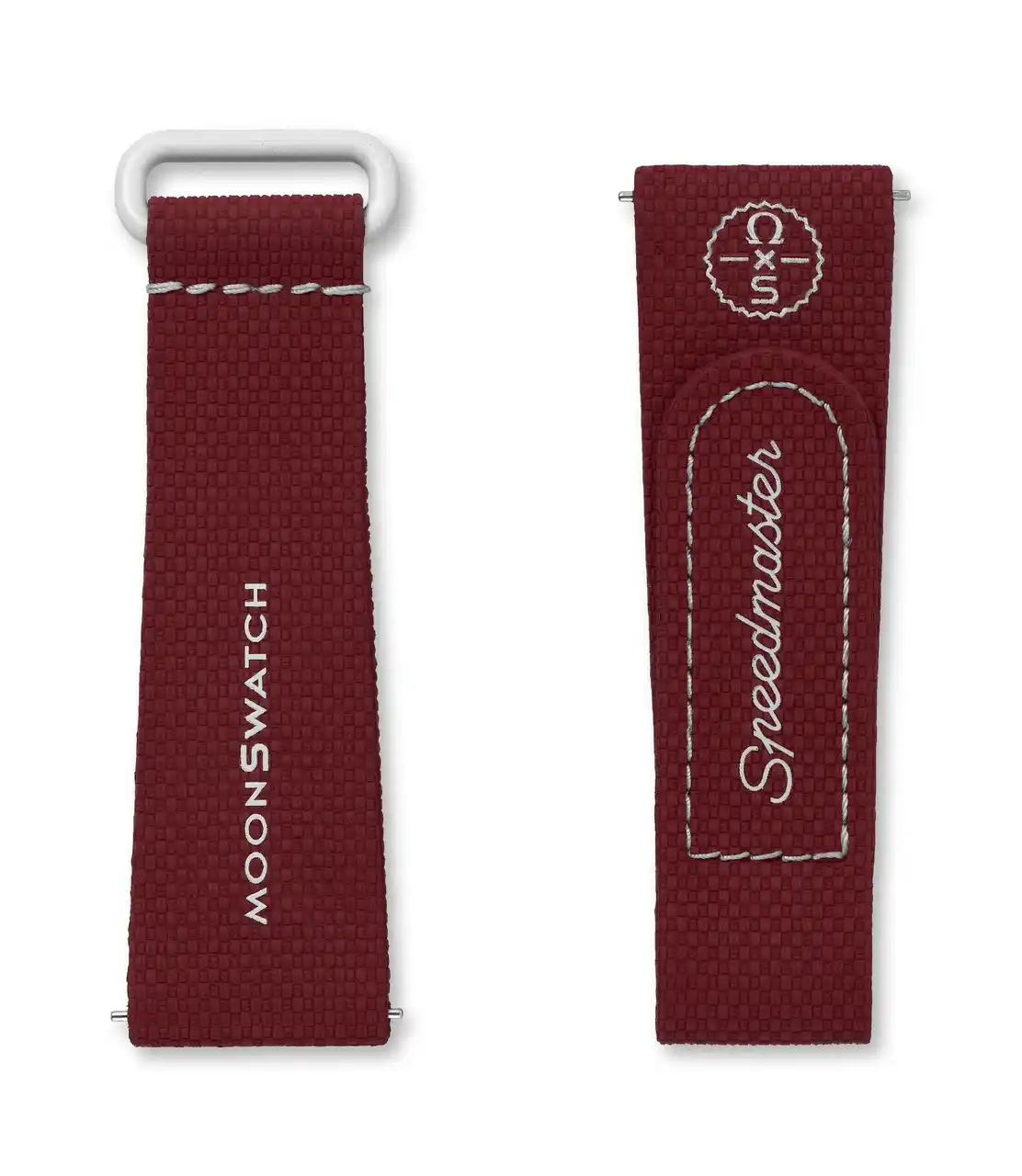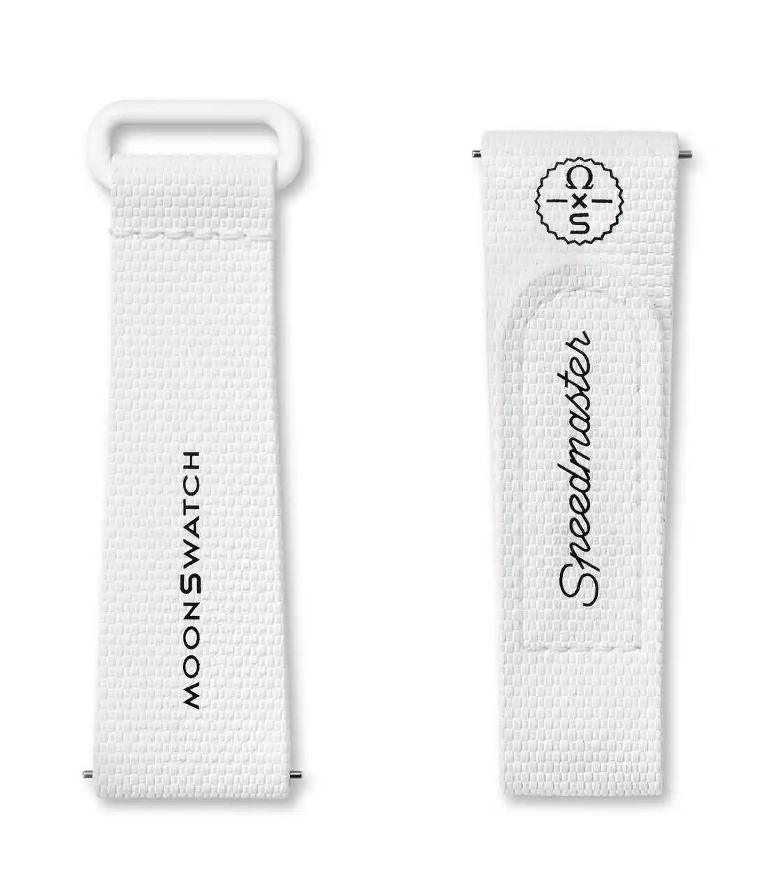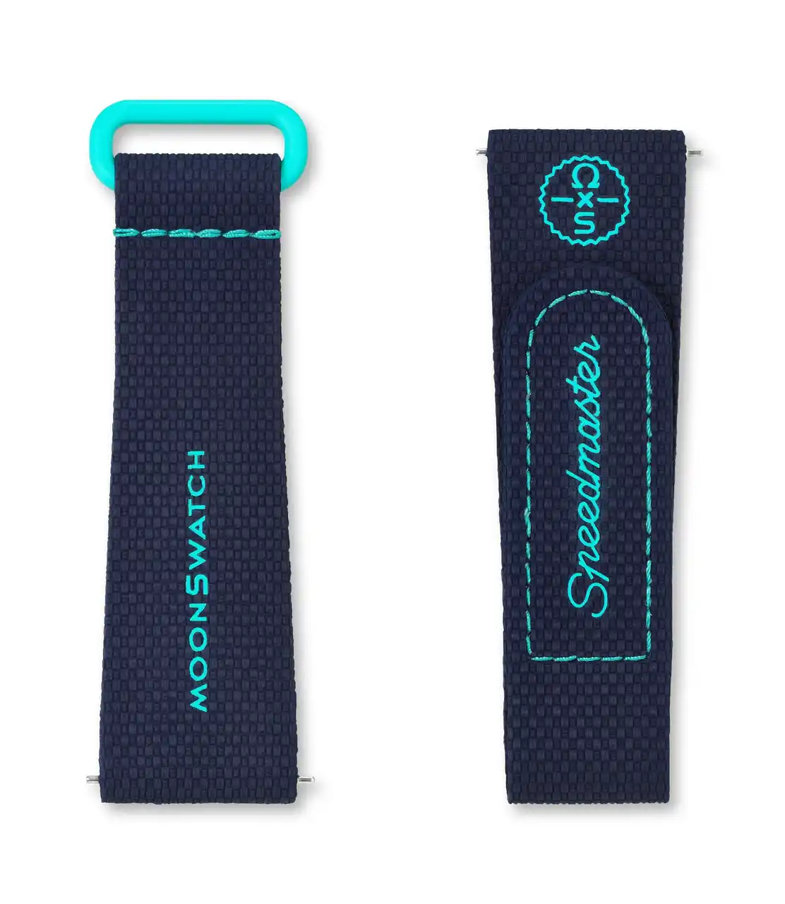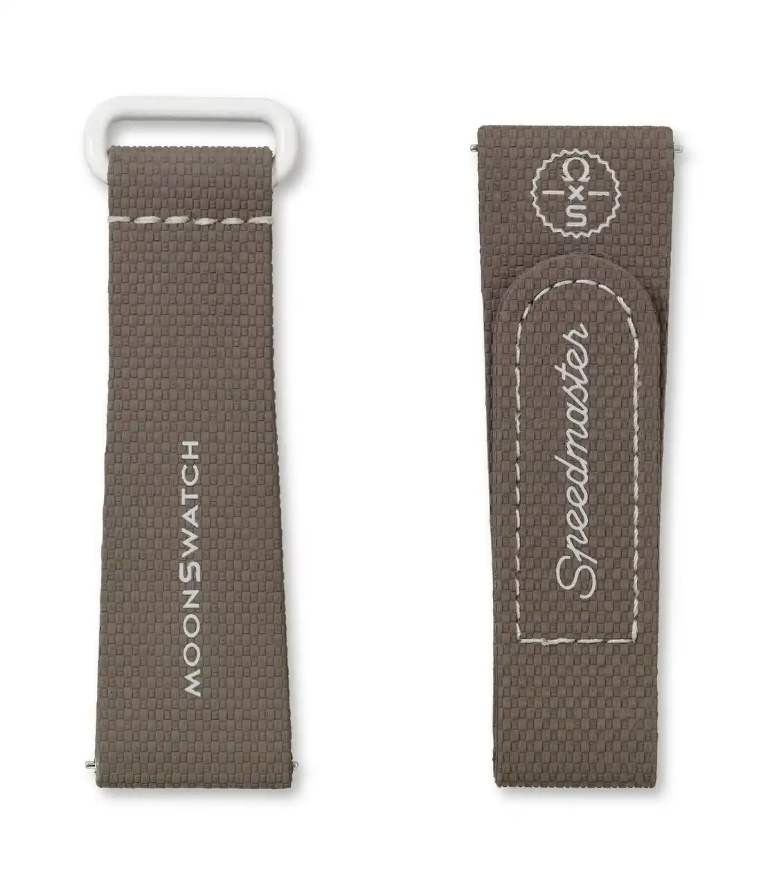 高品質のラバー製で、両面にテクスチャーパターンが施され、BioceramicループとVELCRO(R)クロージャーを採用しているのが特徴。ストラップは表側が宇宙服、裏側が月面のクレーターをイメージしています。Bioceramic MoonSwatch コレクションの時計と同様に、ストラップにもOMEGA X Swatch、MoonSwatch、そしてアイコニックなSpeedmasterのロゴがあしらわれています。 また、どのストラップにもクイックリリースシステムが装備され、ストラップの簡単な交換が可能な専用ツールが付属しています。 |