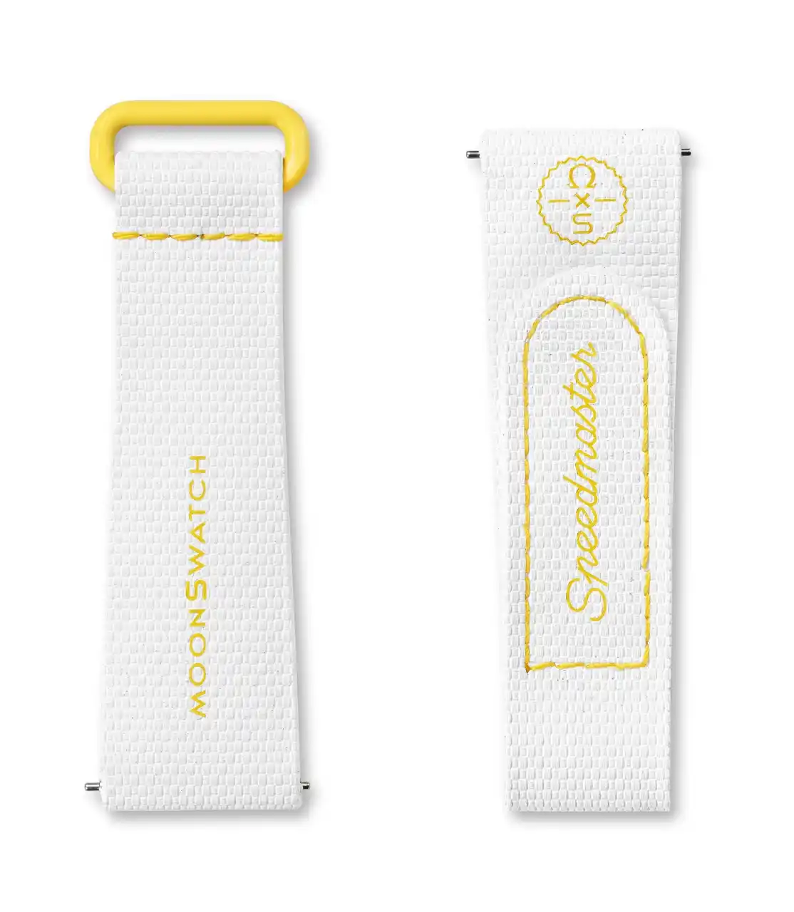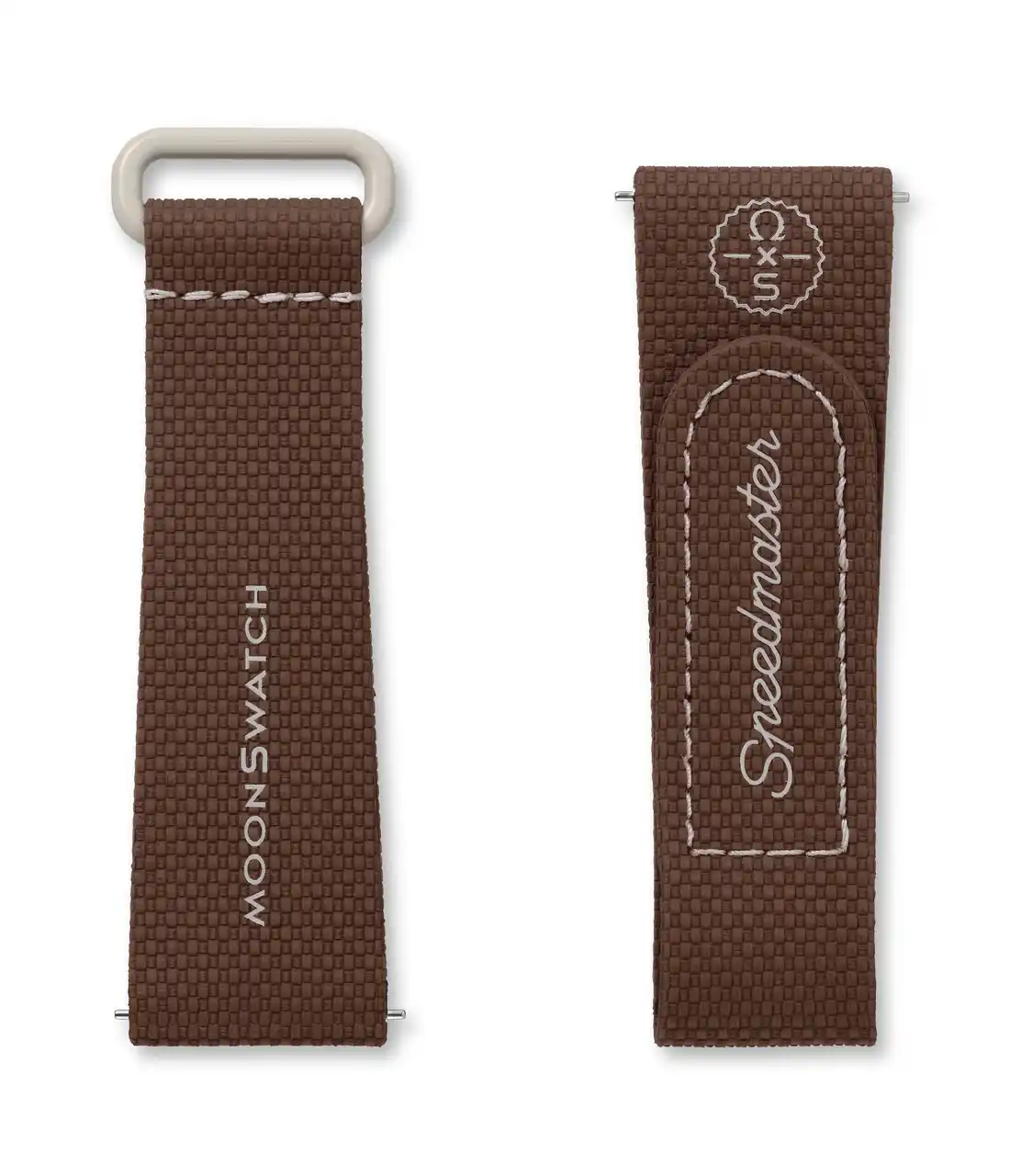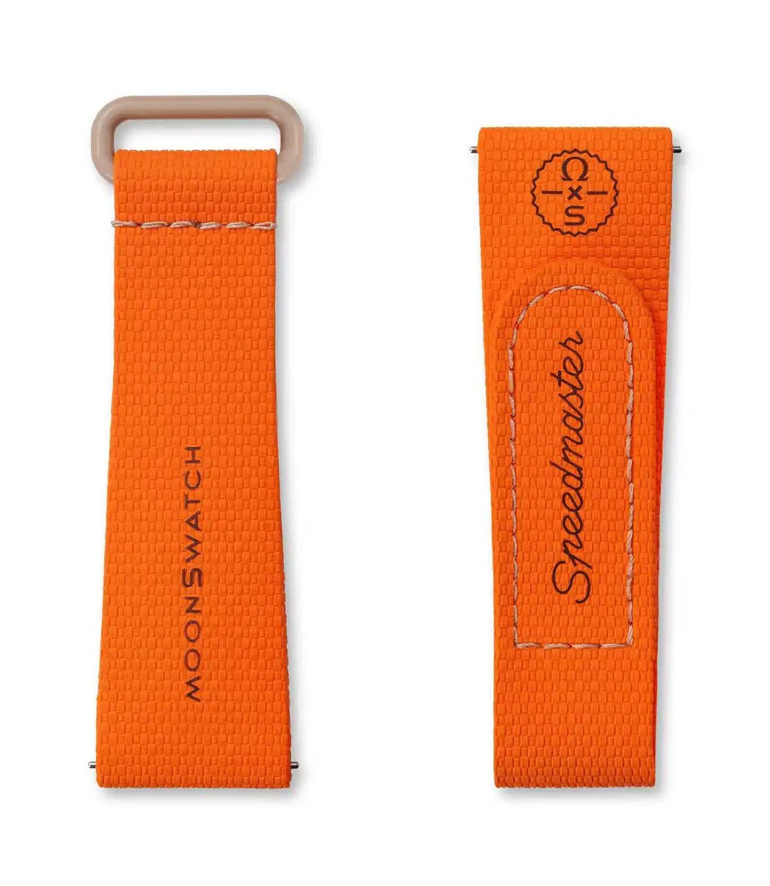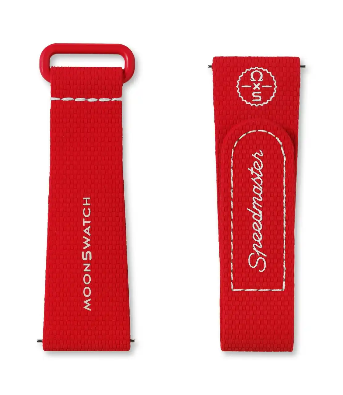 高品質のラバー製で、両面にテクスチャーパターンが施され、BioceramicループとVELCRO(R)クロージャーを採用しているのが特徴。ストラップは表側が宇宙服、裏側が月面のクレーターをイメージしています。Bioceramic MoonSwatch コレクションの時計と同様に、ストラップにもOMEGA X Swatch、MoonSwatch、そしてアイコニックなSpeedmasterのロゴがあしらわれています。 また、どのストラップにもクイックリリースシステムが装備され、ストラップの簡単な交換が可能な専用ツールが付属しています。 |