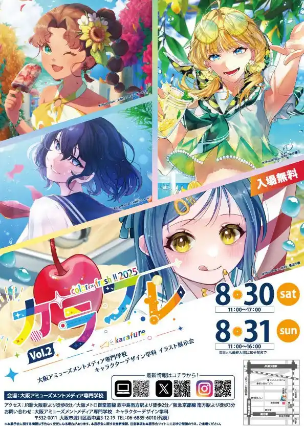 | 大阪アミューズメントメディア専門学校キャラクターデザイン学科、在校生全員参加のイラスト展示会「カラフレ - color × fresh !! 2025 -」を8/30(土)、31(日)に開催します。 | |||