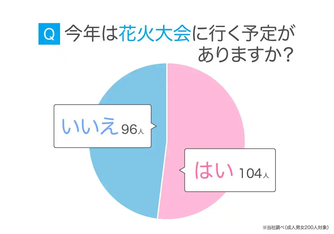 | 成人男女200人に、今年は花火大会に行く予定があるか尋ねたところ、「はい」と答えた人が約半数を占める結果となりました。 | ||||||||||||||||||