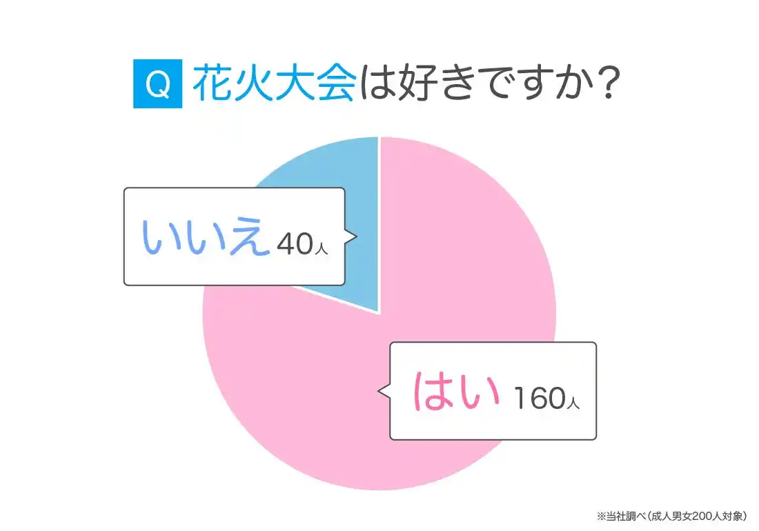 | まずは、成人男女200人に花火大会が好きか尋ねてみたところ、「はい」と答えた人が8割を占めました。 | ||||||||||||||||||