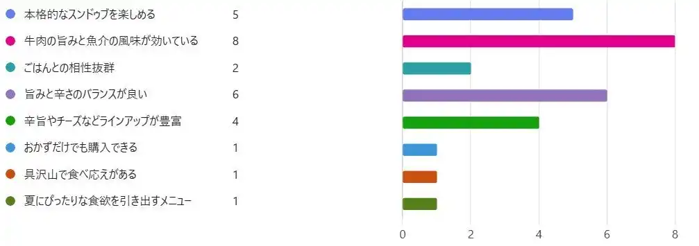 「赤の牛スンドゥブ」で最も多くの票を集めたのは『牛肉の旨みと魚介の風味が効いている』というポイントでした。以下2位は『旨みと辛さのバランスが良い』、『本格的なスンドゥブを楽しめる』でした。 |