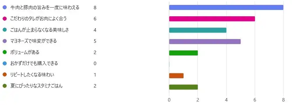 「黒の牛豚ダブル焼肉」で最も多くの票を集めたのは『牛肉と豚肉の旨みを一度に味わえる』というポイントでした。以下2位は『こだわりのタレがお肉によく合う』、『マヨネーズで味変ができる』でした。 |