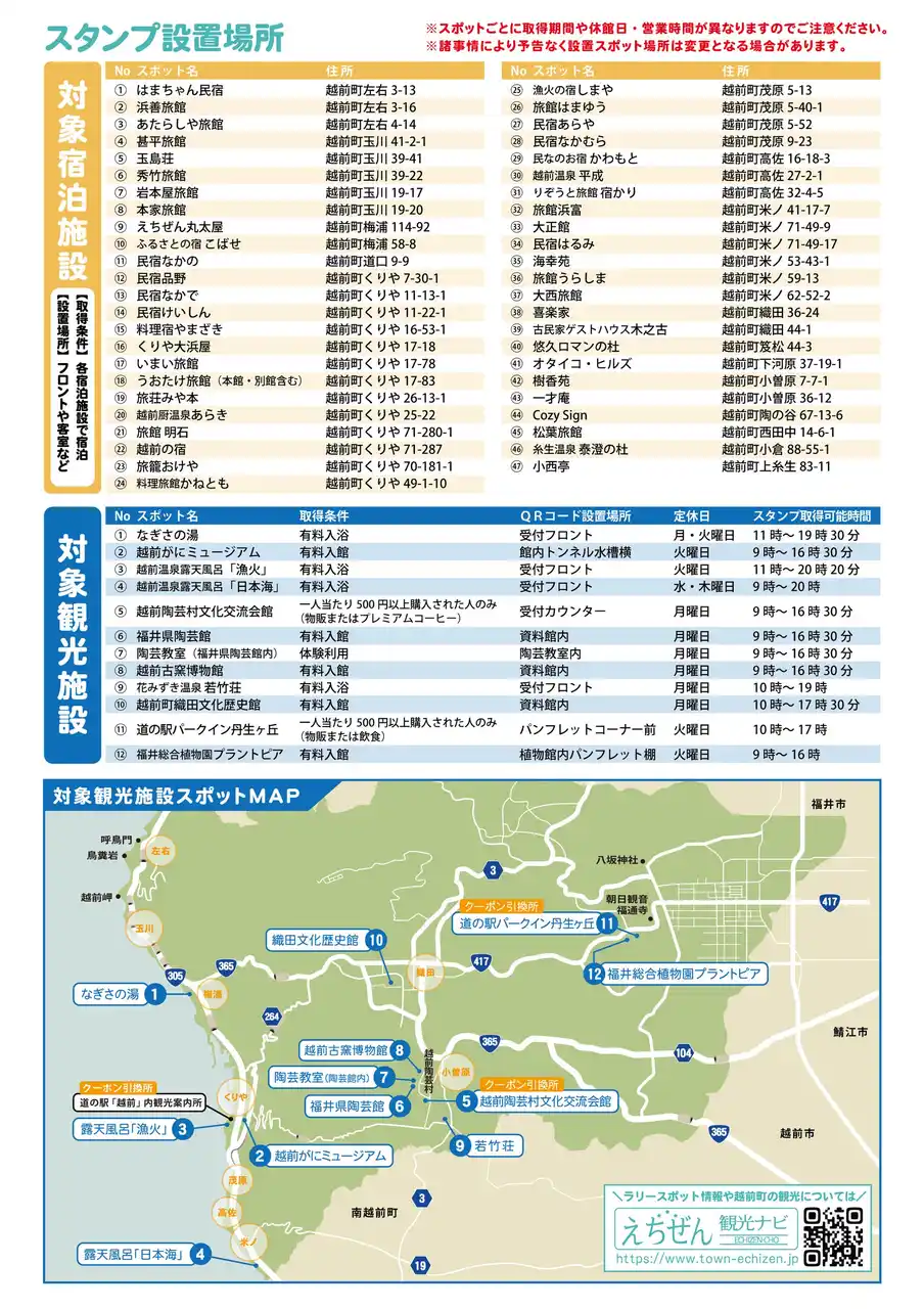 | 福井県越前町内の宿泊施設47施設と観光施設12施設を対象に、宿泊施設で泊まることで取得できる【宿泊施設スタンプ】と観光施設を利用して取得できる【観光施設スタンプ】の2種類を集めることで、越前町内の100以上の店舗や施設で利用できる「観光クーポン券」2,000円分と引換できます。 | ||||||||||||||