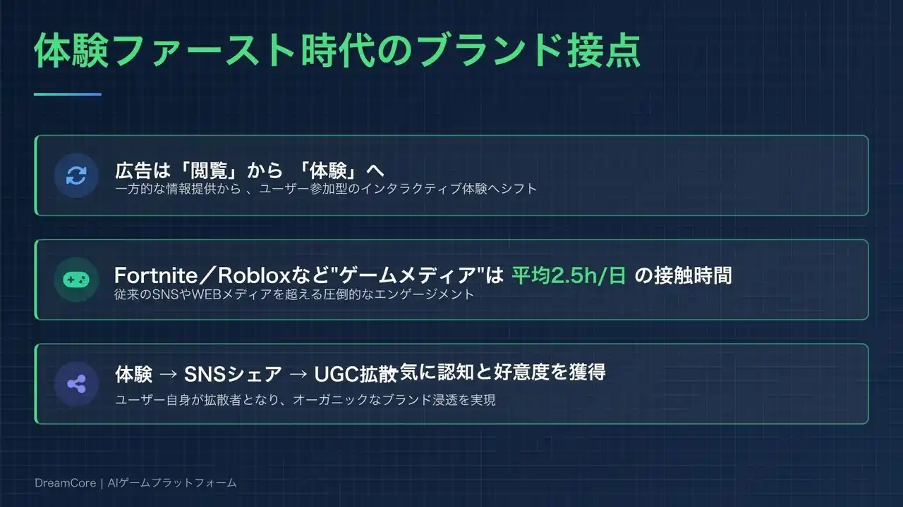 | 『DreamCore』は、Roblox/Fortnite世代のZ世代・α世代が親しむ“ゲーム感覚”を活かし、ブラウザ1クリックで体験できる縦画面ミニゲームを最短48時間・1本10万円(税込)から提供するAIゲーム生成プラットフォームです。 |