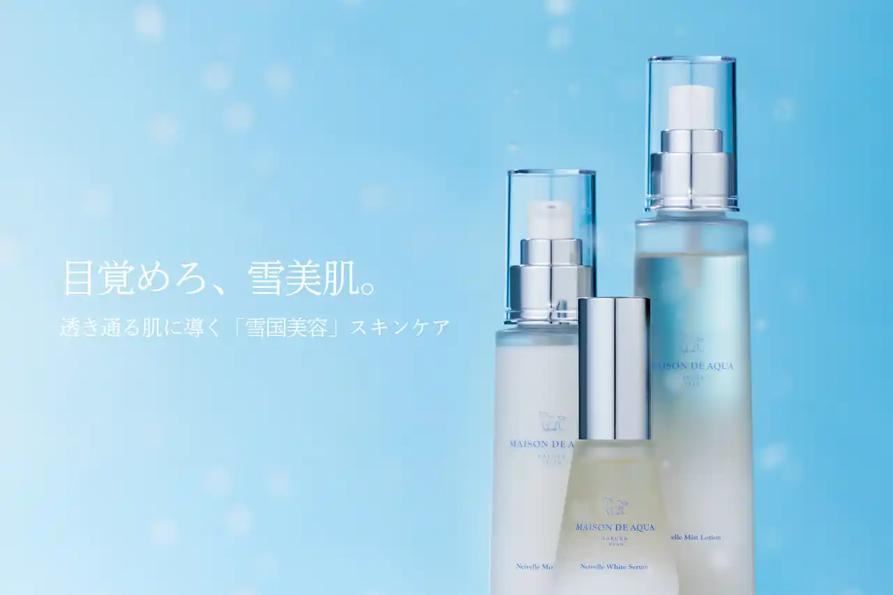 「雪美肌(ゆきみはだ)」は、過酷な環境下で育つ雪国の植物の生命力とメゾン・ド・アクアが追求する「水の潤い」を表現したキャッチコピーとなっており、雪国で暮らす女性の肌のように強く透明感※1のある肌へ導くスキンケアを表現しています。 |
