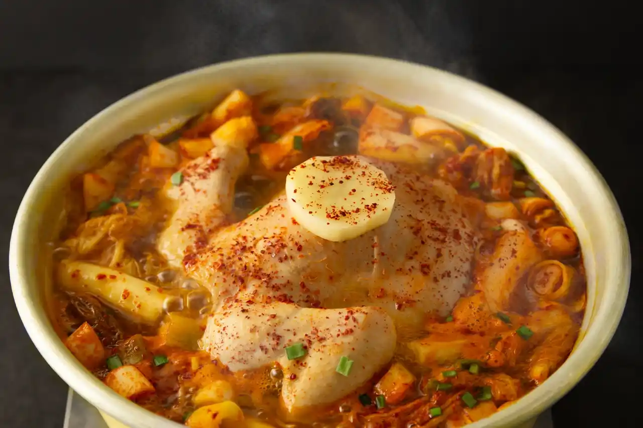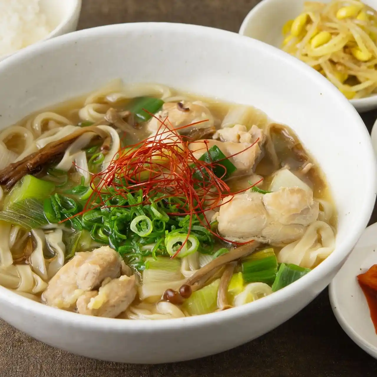 鶏肉や野菜をじっくり煮込んだスープの韓国風鶏うどん。 |