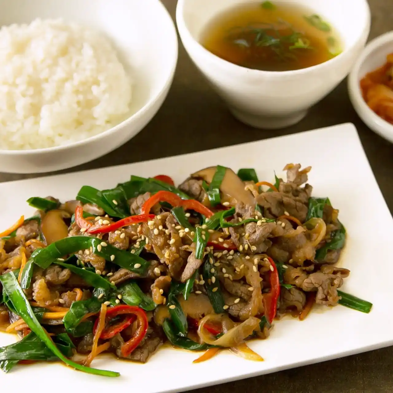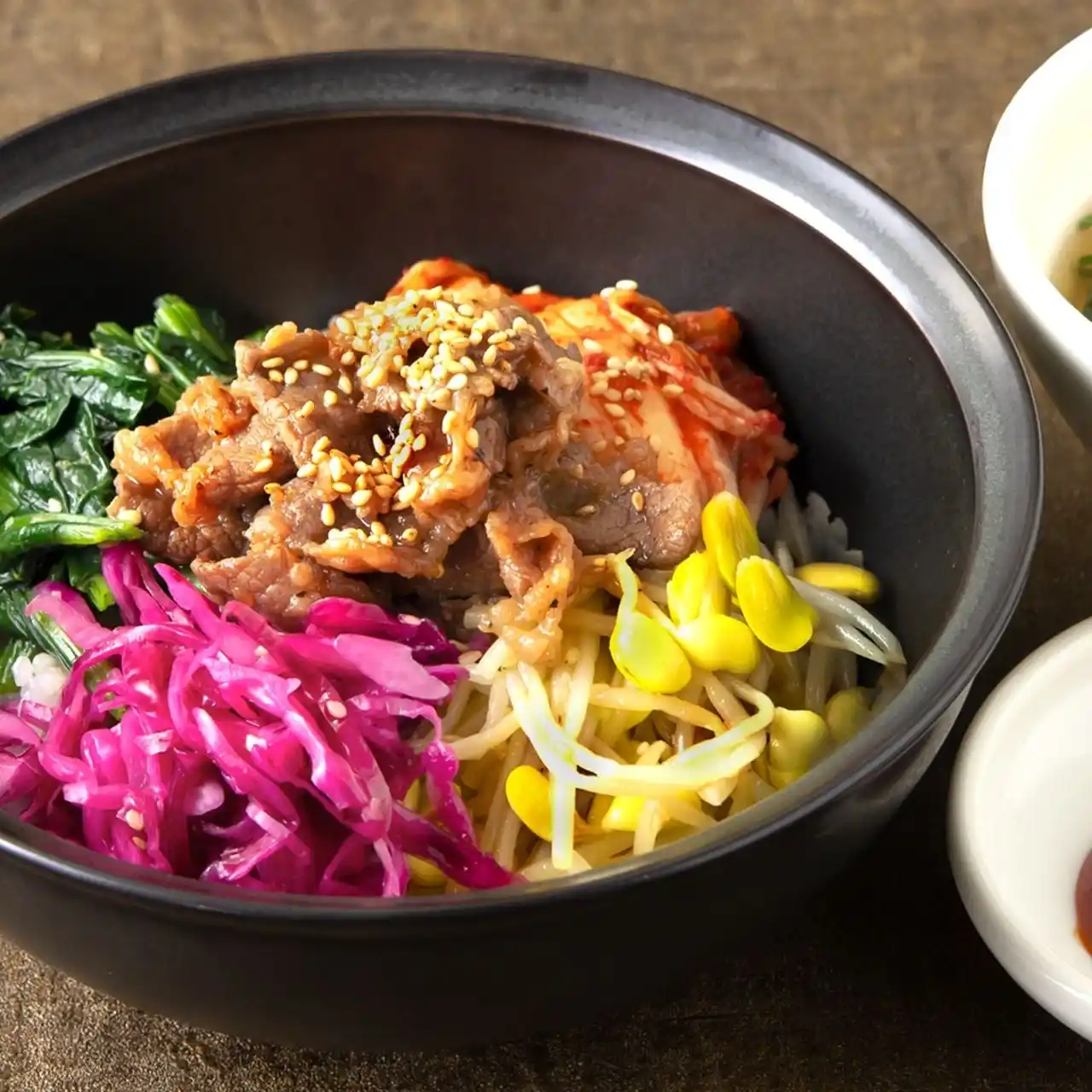 自家製タレで味付けされたプルコギとナムル、キムチの食欲をそそる組み合わせ。美味しく食べる秘訣はお皿の底からよく混ぜること! |