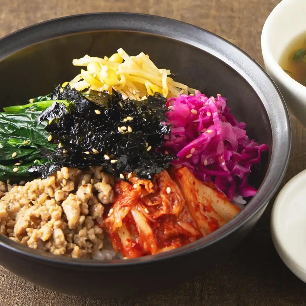 ピリ辛キムチと鶏そぼろが絶妙なピビンバ。よく混ぜてお 召し上がりください。 |