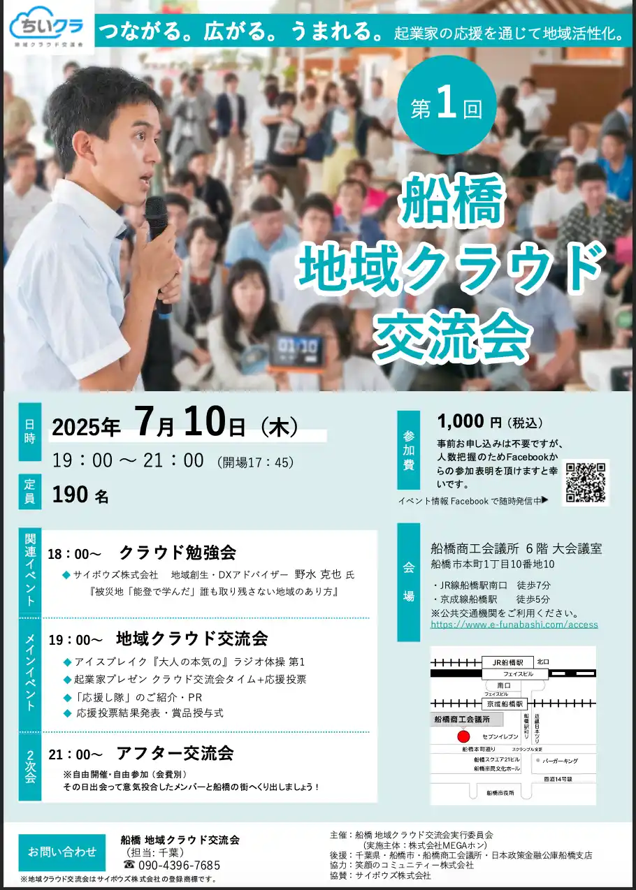 船橋 地域クラウド交流会実行委員会(実施主体:株式会社MEGAホン|代表:千葉 陽平)は、船橋市の起業家と地域住民がリアルに交流し、相互に応援し合う新しいスタイルの交流イベント「第1回 船橋 地域クラウド交流会」を2025年7月10日(木)19時から船橋商工会議所6階にて開催いたします。 |