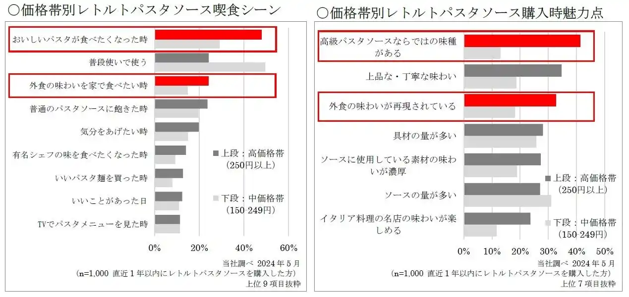 高価格帯パスタソースに対しては、外食店のようにおいしく、非日常的なメニューを楽しめることや、高級パスタソースならではのバリエーションや味わいへの需要が高くなっています。 |