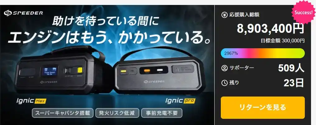 | 引き続き、スーパーキャパシタ式ジャンプスターター【Ignic(イグニック)】へのご支援と応援をどうぞよろしくお願いいたします。 | |||