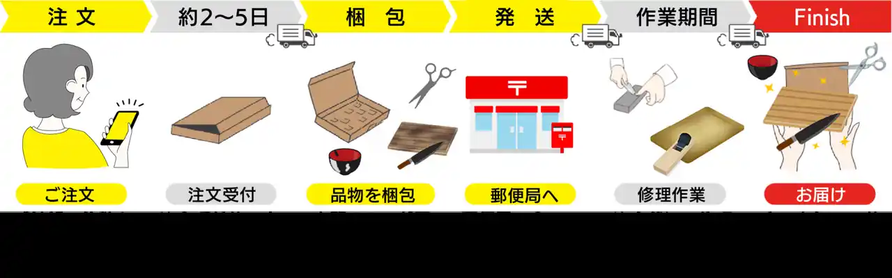 例えば包丁研ぎの場合、包丁を入れた専用BOXをポストに投函してから約1週間でスパッと切れる包丁が手元に届きます。価格は1本3,000円~です。 |