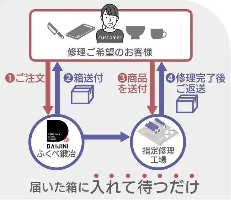 DAIJINIは、ご注文後に届く箱に修理対象の道具を入れてポストに入れるだけ。専門の職人が修理をし、返送します。幅広い年齢の方にご利用いただきたいため、手順はシンプルに特化しました。私たちの独自性と強みは、修理に出す事の手軽さにあります。 |