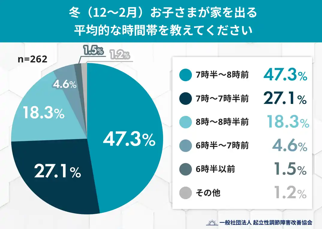 寒さが厳しくなる冬は、「朝なかなか起きられない」「準備に時間がかかる」といった声が、子どもを持つ家庭から多く聞かれます。一般社団法人 起立性調節障害改善協会は、小学生~高校生の子どもを持つ保護者262名を対象に、冬季における登校時間の変化について調査を実施。その結果、約45%の家庭で「冬は登校時間が遅くなることがある」と感じている実態が明らかになりました。登校時間の変化に加え、その背景となる理由や、家庭で取り入れたい対策についても調査結果から読み解きます。 |