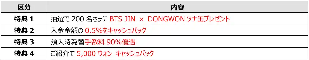 株式会社SBJ銀行(本店:東京都港区、代表取締役社長:並木 稔「以下、当行」)は、2026年1月19日(月)より、「SBJトラベルKデビット」をリリースいたします。また、併せまして、本商品のリリースを記念して、リリース記念キャンペーンを実施いたします。本キャンペーンは、各種手数料の優遇やキャッシュバック、抽選で200名様にBTS JINの関連商品をプレゼントする大変お得な内容となっておりますので、この機会にぜひ当行とのお取引をご検討ください。 |