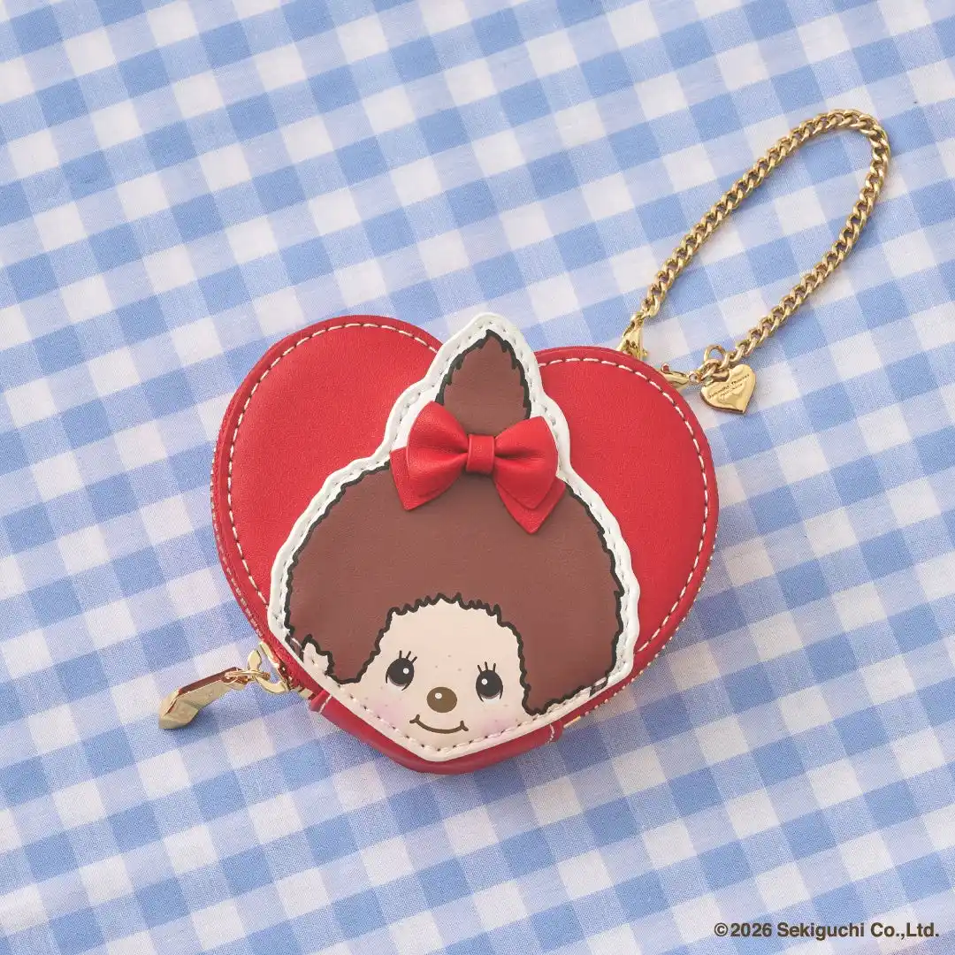 「モンチッチちゃん」の愛らしい顔をワッペン風にデザインしたハート型ポーチ。 |