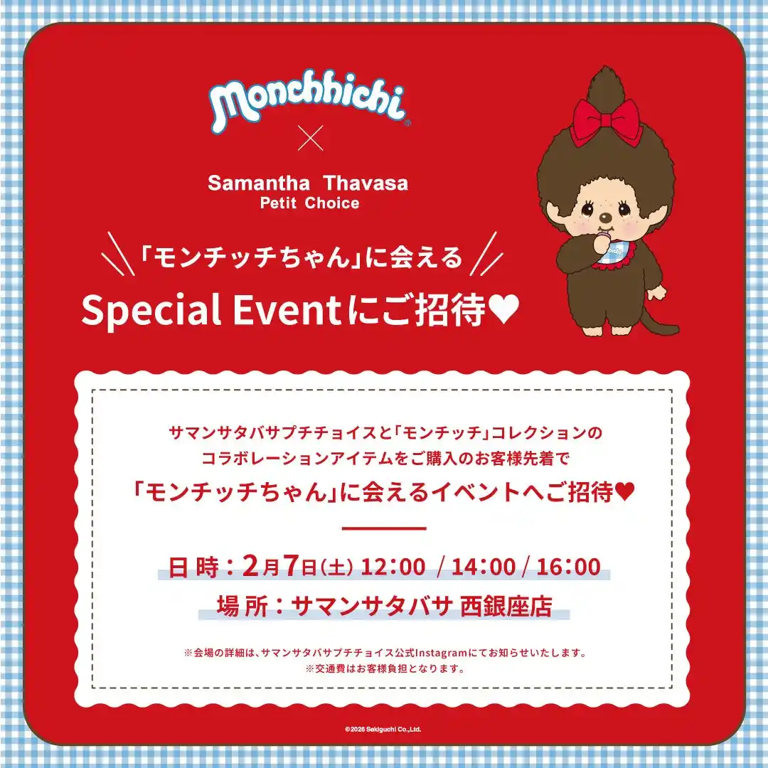 サマンサタバサプチチョイスと「モンチッチ」コレクションのコラボレーションアイテムをご購入のお客様先着で「モンチッチちゃん」に会えるイベントへご招待! |