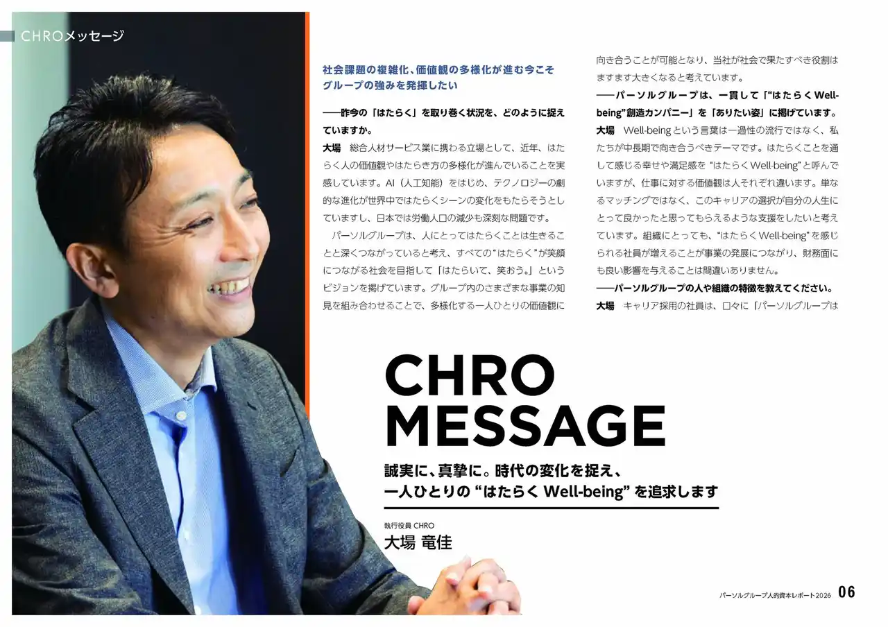 「はたらいて、笑おう。」をビジョンに掲げるパーソルホールディングス株式会社(本社:東京都港区、代表取締役社長 CEO:和田 孝雄)は、パーソルグループの人的資本に関わる考え方や取り組みを幅広いステークホルダーに理解していただくことを目的として、1月20日(火)に「パーソルグループ人的資本レポート2026」を発行いたしました。