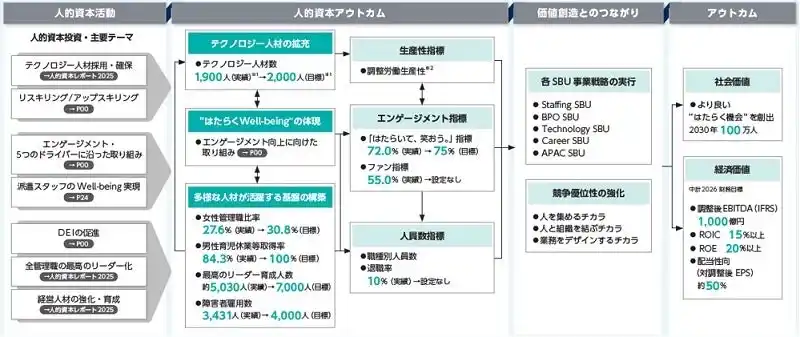 パーソルグループは「パーソルグループ中期経営計画2026」に基づき人的資本投資を進めており、この投資と2030年の価値創造(アウトカム)の関連を「人的資本インパクトパス」として2024年度に可視化しました。今年度のレポートでは、人的資本戦略の主要なKPIの進捗状況を伝えています。 |