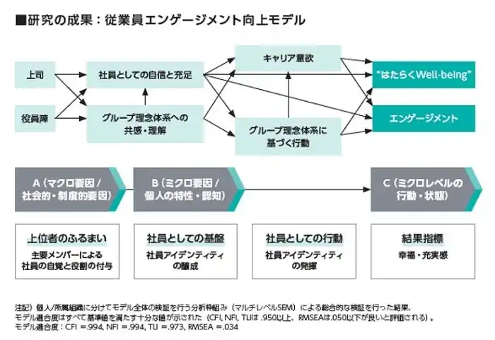 また、人的資本戦略の重要モニタリング指標である社員の「エンゲージメント」について、過去のエンゲージメントサーベイ結果のデータを用いて、それがどのようなメカニズムで高まるのか研究し、「社員エンゲージメント向上モデル」を新たに構築しました。社員のエンゲージメントや“はたらくWell-being”向上の施策検討において活用していきます。 |