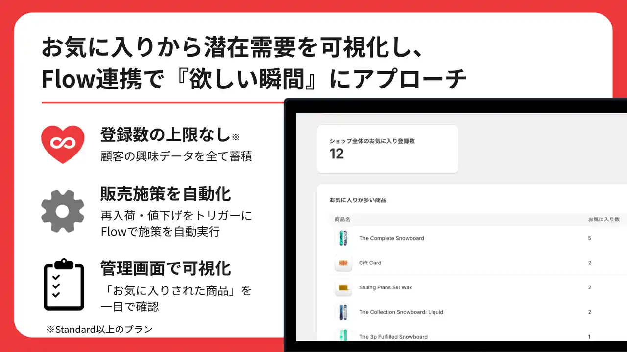 一方でマーチャント側では、お気に入り商品やその購入状況を管理画面で確認できるほか、Shopify Flowと連携することで、再入荷や価格変更といったタイミングを次のアクションにつなげることが可能です。 |