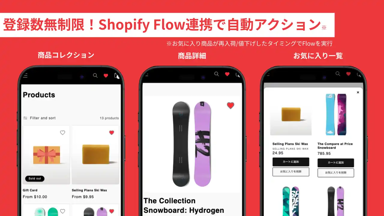 主な機能:お気に入り登録機能、お気に入り商品・購入状況の管理画面表示、Shopify Flow連携 |