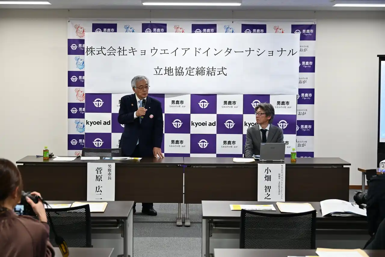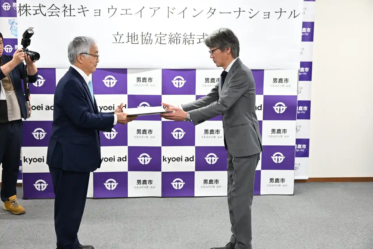 全国でエリアマーケティング事業を展開する株式会社キョウエイアドインターナショナル(本社:東京都千代田区 代表取締役:廣瀬勝⺒ 以下「キョウエイアド」)は、自社のサテライトオフィスを設置した秋田県男鹿市と、令和7年12月19日に立地協定を締結しました。