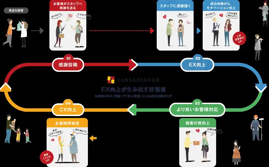 | お客様から商業施設や店舗で働くスタッフに「感謝」の気持ちをスマホ上で簡単に送ることができ、送られた「感謝」をスタッフに届けることができる機能です。 | |||||||||||||||