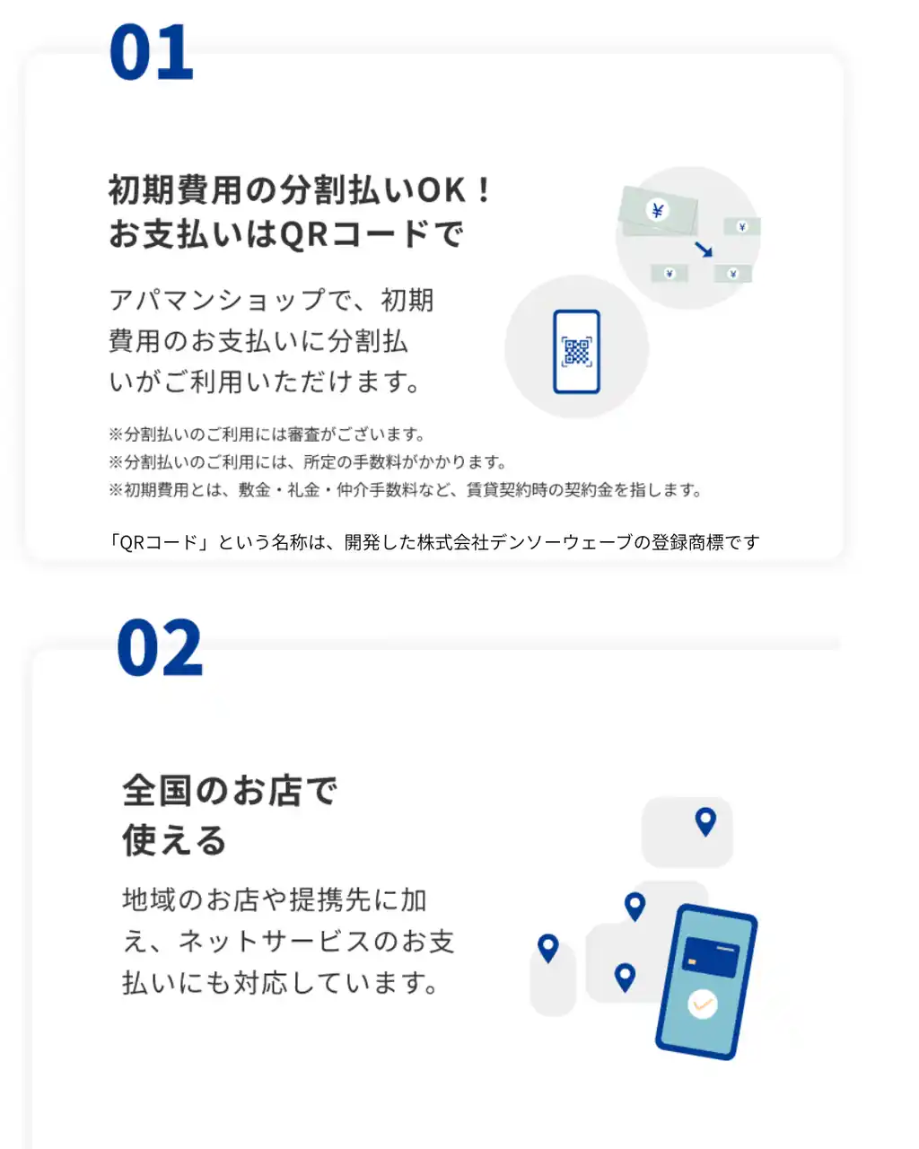 入居一時金の分割払いに対応するほか、日本全国の店舗でタッチ決済が利用可能となります。 |