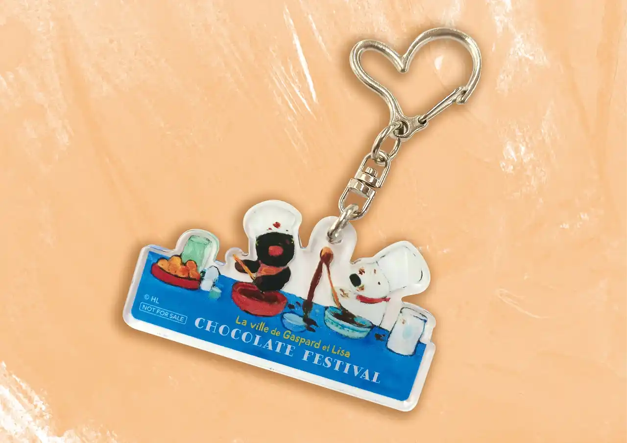 さらに「チョコっとカード」をお持ちのお客様が、別店舗で2,000円以上のお買い物をしていただいた場合、「おっチョコちょいアクリルキーホルダー」をプレゼントします。リサとガスパールがいろいろなところにチョコレートを付けながらも頑張ってクッキングしている様子がとても愛らしいデザインです。 |