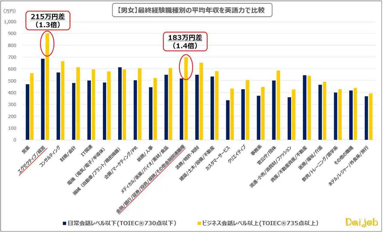 3. 最終経験職種別の平均年収を英語力別で比較すると「金融/投資/保険/その他金融関連職種」が1.4倍で183万円の年収差、「エグゼクティブ/経営」が215万円で1.3倍の年収差 |