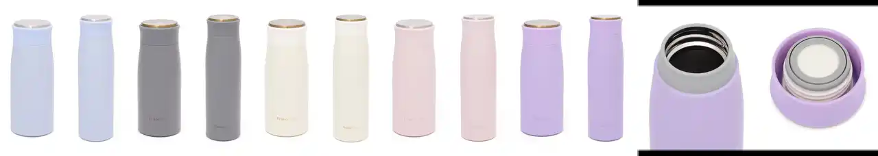 定番人気のステンレスボトルが、トレンドに合わせた明るいカラーリングにリニューアルしました。マットな質感にメタリックのアクセントが映える、エレガントなデザインの軽量ステンレスボトルです。350mlは約180g、550mlは約225gと軽量で持ち運びやすく、真空二重構造で保温・保冷効果にも優れています。優しい口当たりのカバー付き飲み口、デスクに置いたときも静かなシリコン製フットパッドなど、細部まで使いやすさにこだわっています。デザインを合わせたお弁当箱やカトラリーとのコーディネートを楽しめます。 |