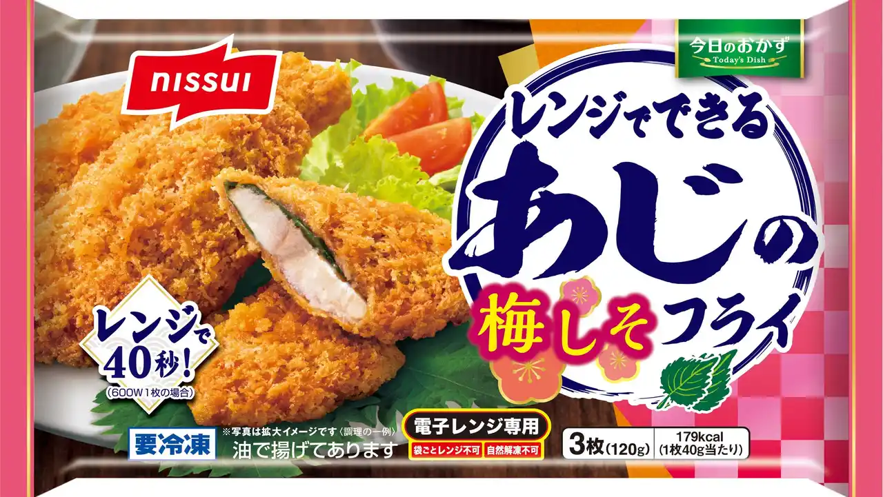 ・食卓のおかずにぴったりな大きめサイズのアジの梅しそフライです。 ・アジフライの中に、梅のさわやかな酸味に宗田鰹節の旨みを重ねたソースを入れました。 ・風味が活きる生鮮の大葉を使用しています。 ・電子レンジ加熱で、揚げたてのようなサクッと軽い衣のフライが味わえます。 ・独自配合のバッター液と粗目の自家製パン粉により、軽い食感の衣を実現しました。 ・トレーごと電子レンジで温められます |