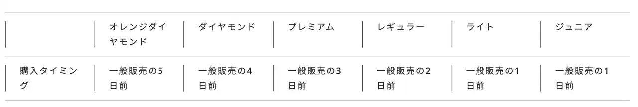 | 後援会会員ランクに応じて、以下のスケジュールで先行購入をご利用いただけます。 | |||