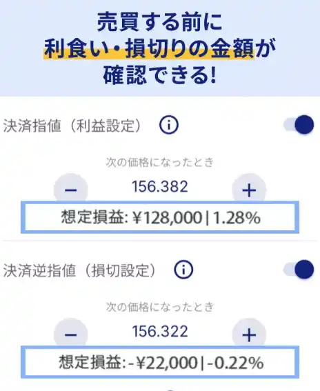 | 発注前に目標とする想定利益価格や、相場が想定と反対方向に動いた場合の想定損失価格を事前に確認可能。取引条件を把握したうえで、安心して判断できる設計です。 | ||||||||||||||