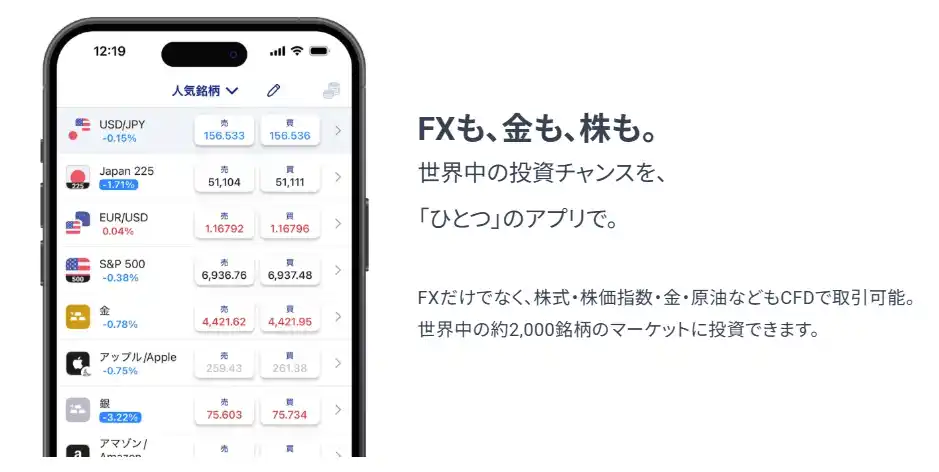 | FX、株式CFD、商品CFDなど、複数の金融商品の価格を1つの画面でまとめて確認。アプリの使い分けは不要で、世界の金融市場へシンプルにアクセスできます。 | ||||||||||||||