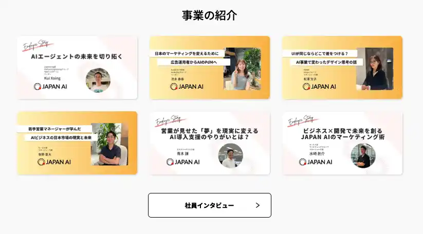 | 今後もJAPAN AIは、求職者との接点を強化し、共に成長できる人材との出会いを加速させます。社員インタビューやプロジェクト事例など、コンテンツを定期的に更新し、JAPAN AIの組織文化や働き方をより深く伝えていきます。 | |||