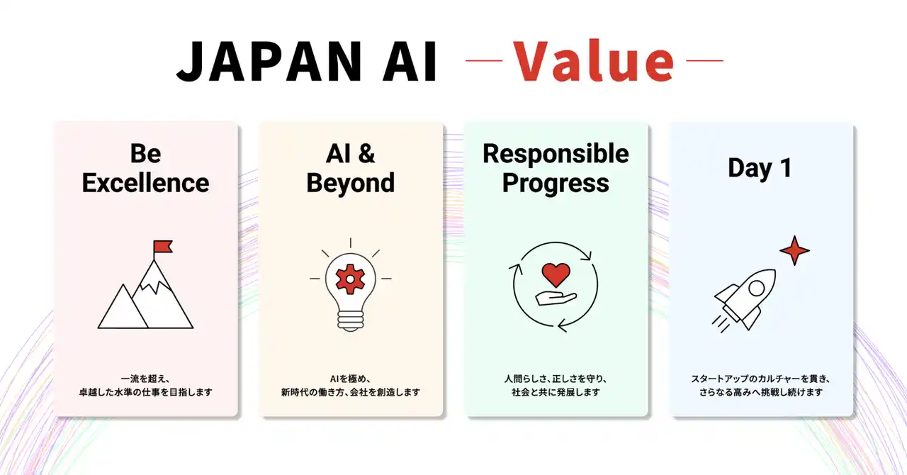 | JAPAN AIでは、卓越性を追求し高い基準で仕事に取り組むこと、AI技術を活用しながらその先の価値を創造すること、社会的責任を果たしながら進歩を続けること、常に初日の気持ちで挑戦し続けることを、全従業員が日々の業務の中で実践しています。 | |||