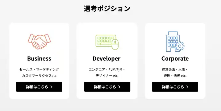 ■選考ポジション ビジネス、エンジニア、コーポレートなど、各職種の詳細情報を掲載しています。 |