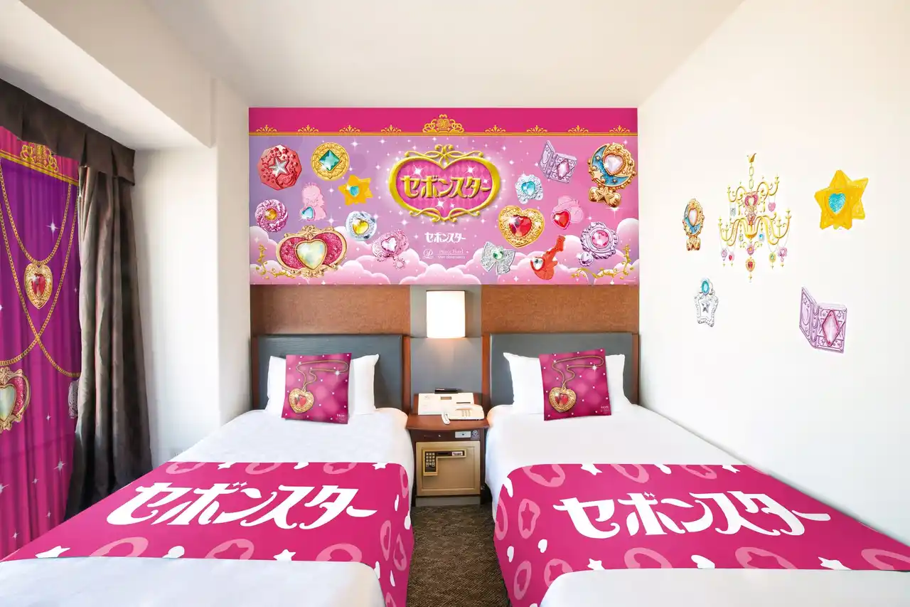 コンセプトルームは『セボンスター』のキラキラの世界観をテーマにした可愛らしい装飾が施されております。お部屋の至るところにペンダントのデザインをモチーフにした装飾がちりばめられ、『セボンスター』の世界観に浸りながらご滞在いただけるファンの憧れを具現化した空間です。 |