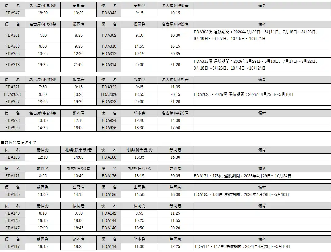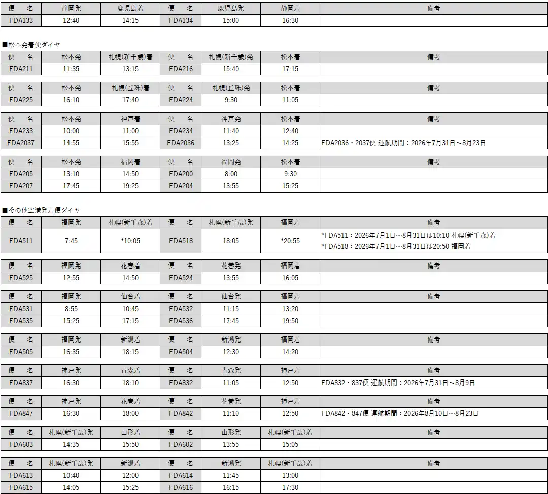 ※6 FDA302便:2026年3月29日~5月11日、7月18日~8月23日、9月19日~9月27日、 |