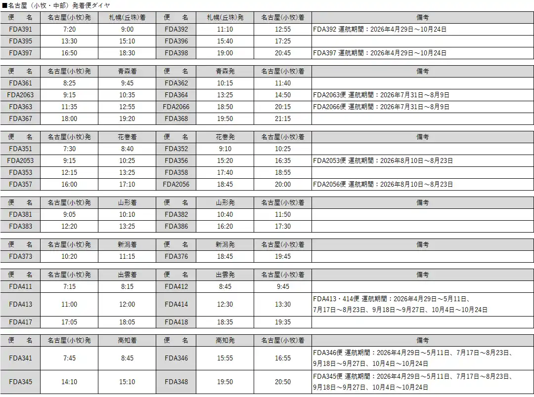 株式会社フジドリームエアラインズ(略称:FDA、本社:静岡県静岡市、代表取締役社長:本田 俊介)は、2026年夏ダイヤ[2026年3月29日(日)~2026年10月24日(土)]ならびに運賃を決定いたしました。 |