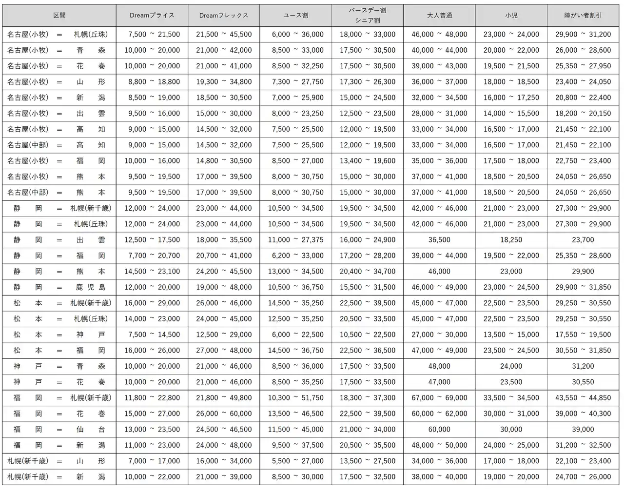 『静岡=出雲』『静岡=熊本』『神戸=青森』『神戸=花巻』線は、今夏ダイヤ期間中は期間限定 |