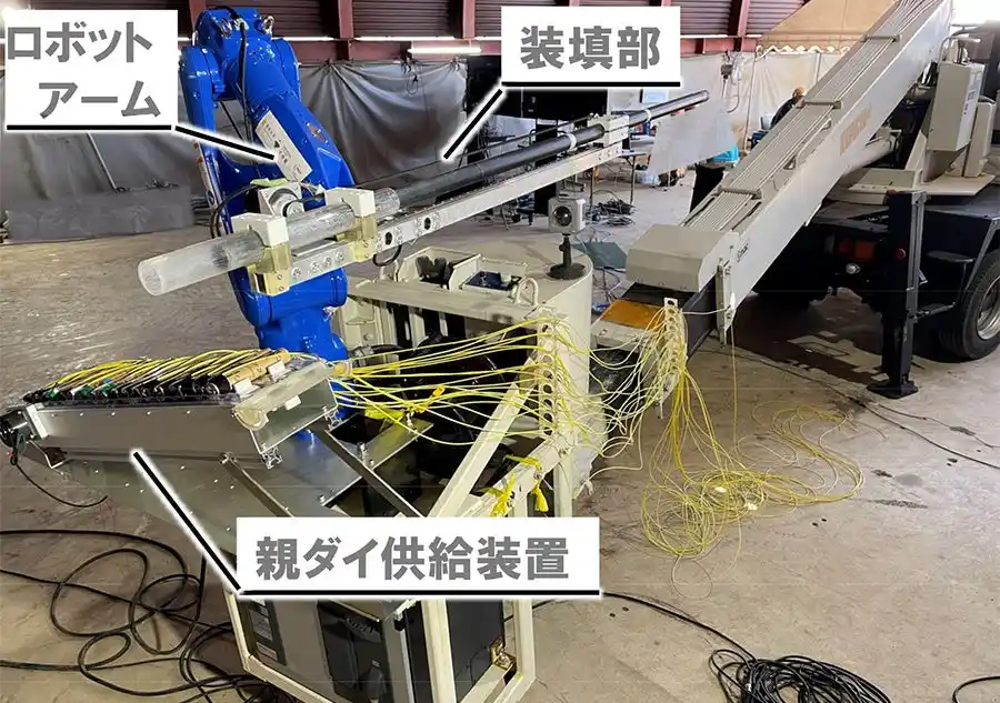 | そこで両者は、リアルハプティクスを応用して、切羽直下での火薬の装填・結線作業を遠隔化・自動化する研究に取り組み、2023年9月に自動火薬装填システムを開発(※6)し、室内試験にてリアルハプティクスを応用し遠隔・自動装填を実現しました。さらに2024年12月に本システムでの実火薬の装填および装薬孔検知技術と連携した自律化に成功(※7)しました。 | |||||||||