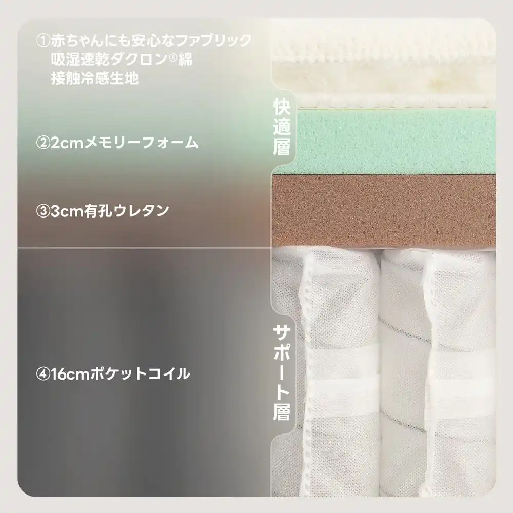 | リバーシブル仕様で季節に合わせて使い分けでき、夏は通気性よく、冬はしっかりとした寝心地を実現。独立ポケットコイルが体のラインに沿って体圧を分散し、寝返りを打っても揺れにくく、安定した眠りをサポートします。 | ||||||||||||