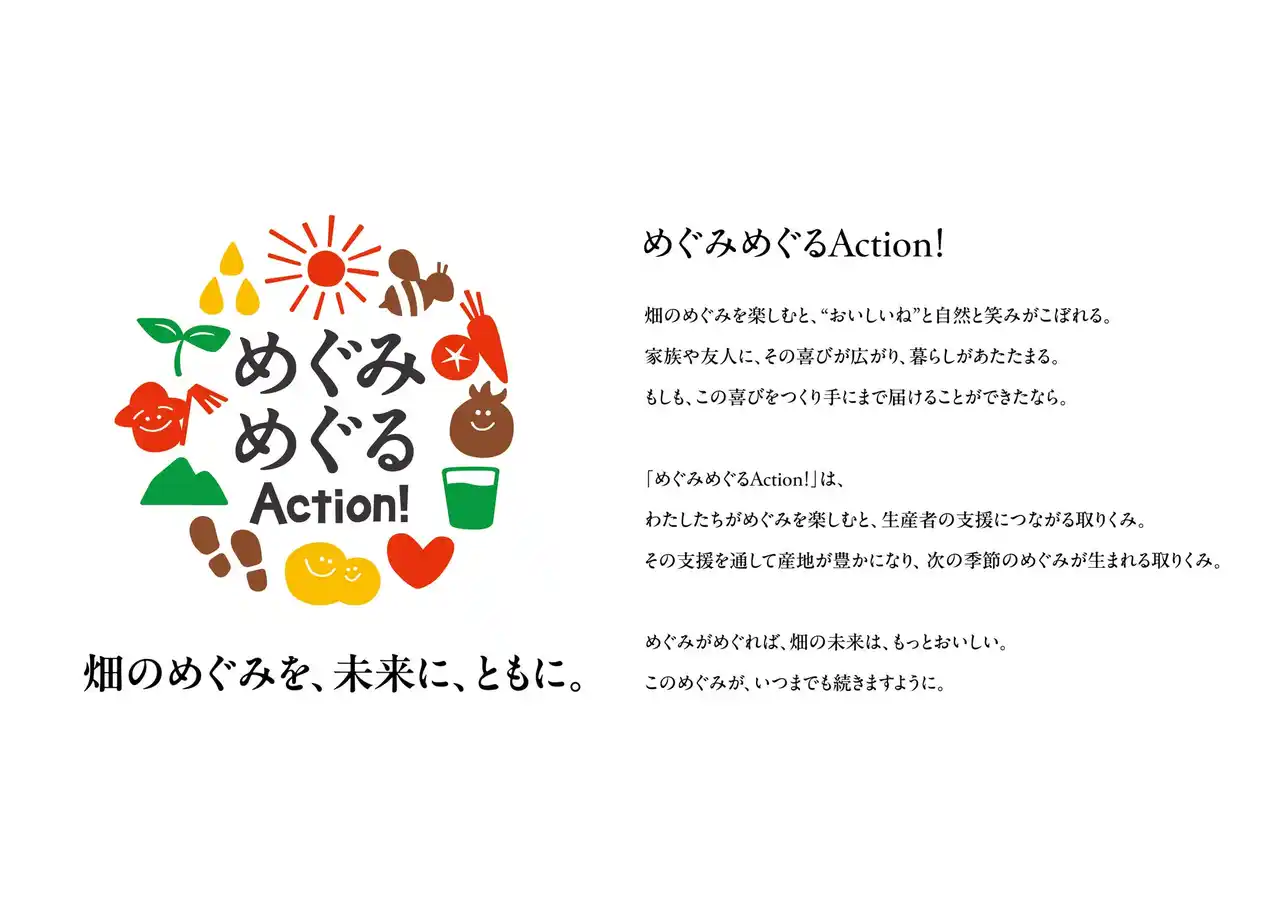 生産者の声に寄り添い、生活者とともに産地を応援する取り組みを広げることで、地域の農業を未来につなげることを目指しています。キーワードは「畑のめぐみを、未来に、ともに。」。生活者がめぐみを楽しむことが、生産者や産地の支援につながる仕組みを「めぐみめぐる Action!」として展開し、地域の魅力を発信しながら、次の季節のめぐみをともに育む循環を広げていきます。 |