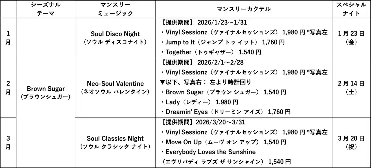 まず、3月まではネオソウルの象徴、ディアンジェロの名盤にオマージュを捧げた“Brown Sugar(ブラウンシュガー)”をテーマに、金沢を拠点に活躍するDJユニット「Vinyl Sessionz(ヴァイナルセッションズ)」が多彩な選曲を披露してまいります。1月はブラックミュージックの黄金時代とも称される1970~80年代を体感する“Soul/Disco Night(ソウルディスコナイト)”、2月はディアンジェロと同時代のアーティストの曲をセレクトした“Neo-Soul Valentine(ネオソウル バレンタイン)”、そして3月は力強く心を揺さぶるサウンドが魅力の“Soul Classics Night(ソウルクラシックナイト)”をマンスリーテーマとして、豊富なセットリストと個性あふれるオリジナルカクテルをお届けし、月1回のスペシャルナイトは1月23日(金)に初開催します。 |